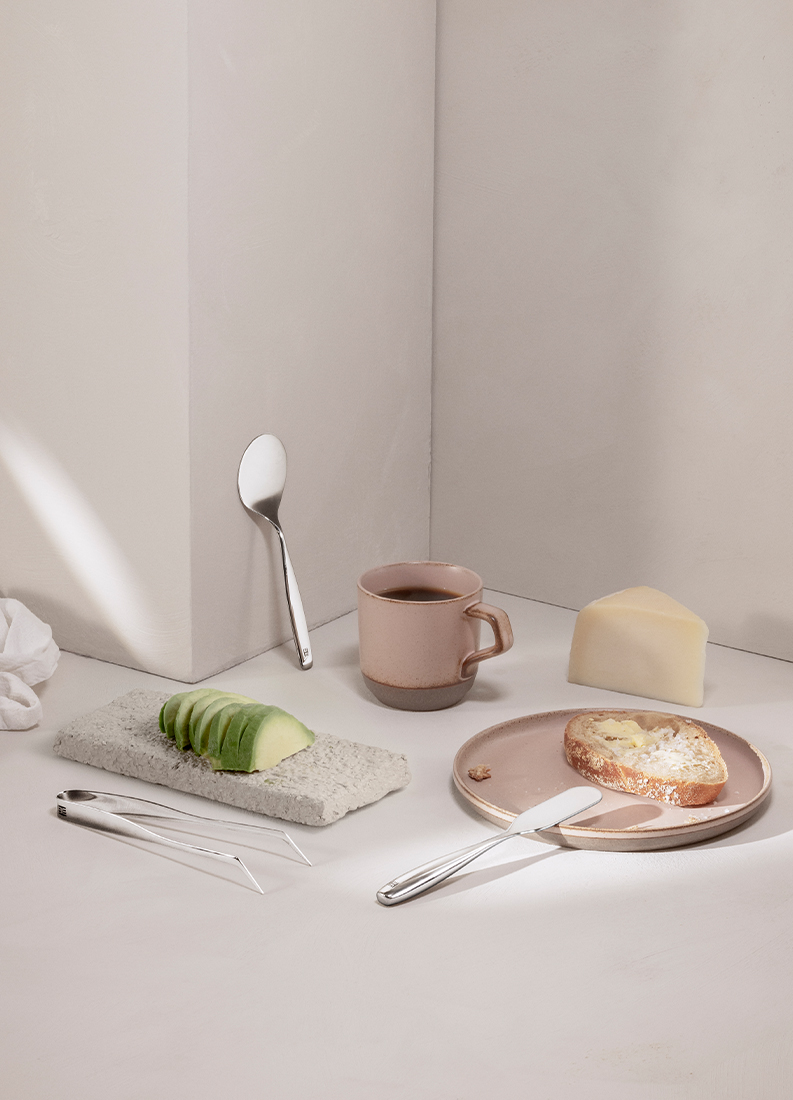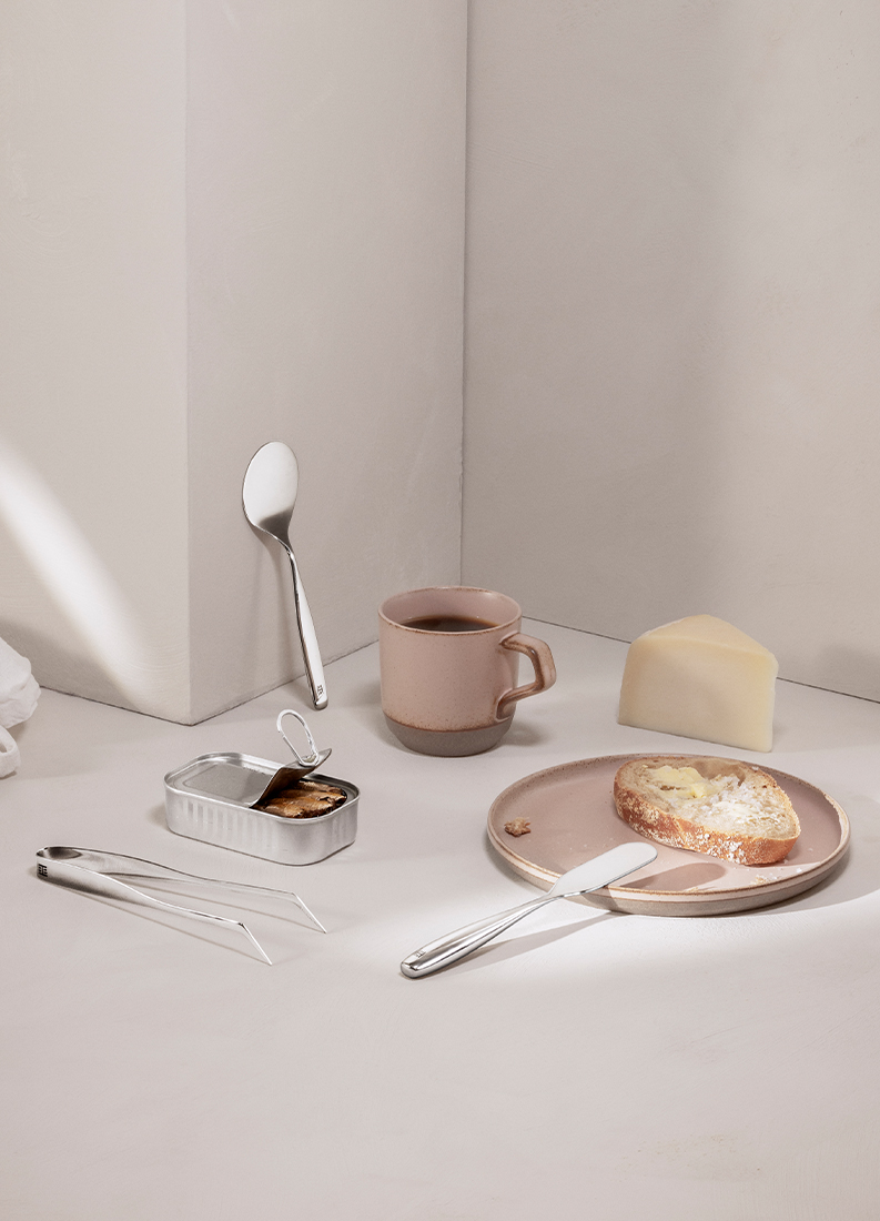 Påleggsklypen gir et presist og godt grep, og passer bra som et gripeverktøy eller når du trenger å stikke for å få fatt i matretter. Syltetøyskjeen har et bredt blad og egner seg til både servering og fordeling av syltetøy, dressinger og lignende. Påleggsspaden er helt ideell til å forsyne seg med større frukt og- grønnsaksskiver eller diverse pålegg, som for eksempel egg. Og sist men ikke minst, smørkniven, inspirert av de gamle smørknivene. Med sitt Hollow Handle-skaft er den dessuten smidig og behagelig i bruk, og egner seg til både smør og mykoster.